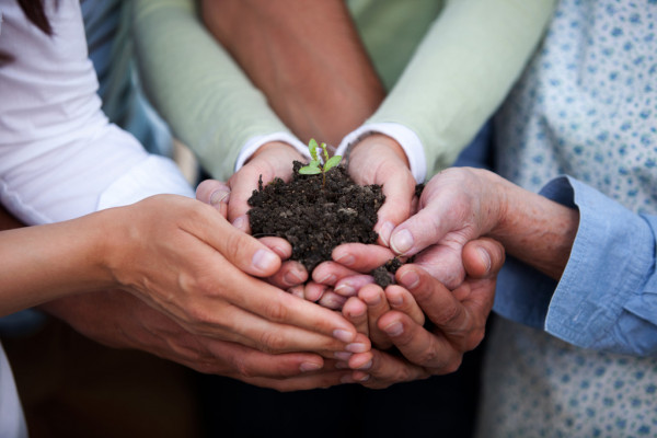 Image: several people with cupped hands holding a small plant in dirt.